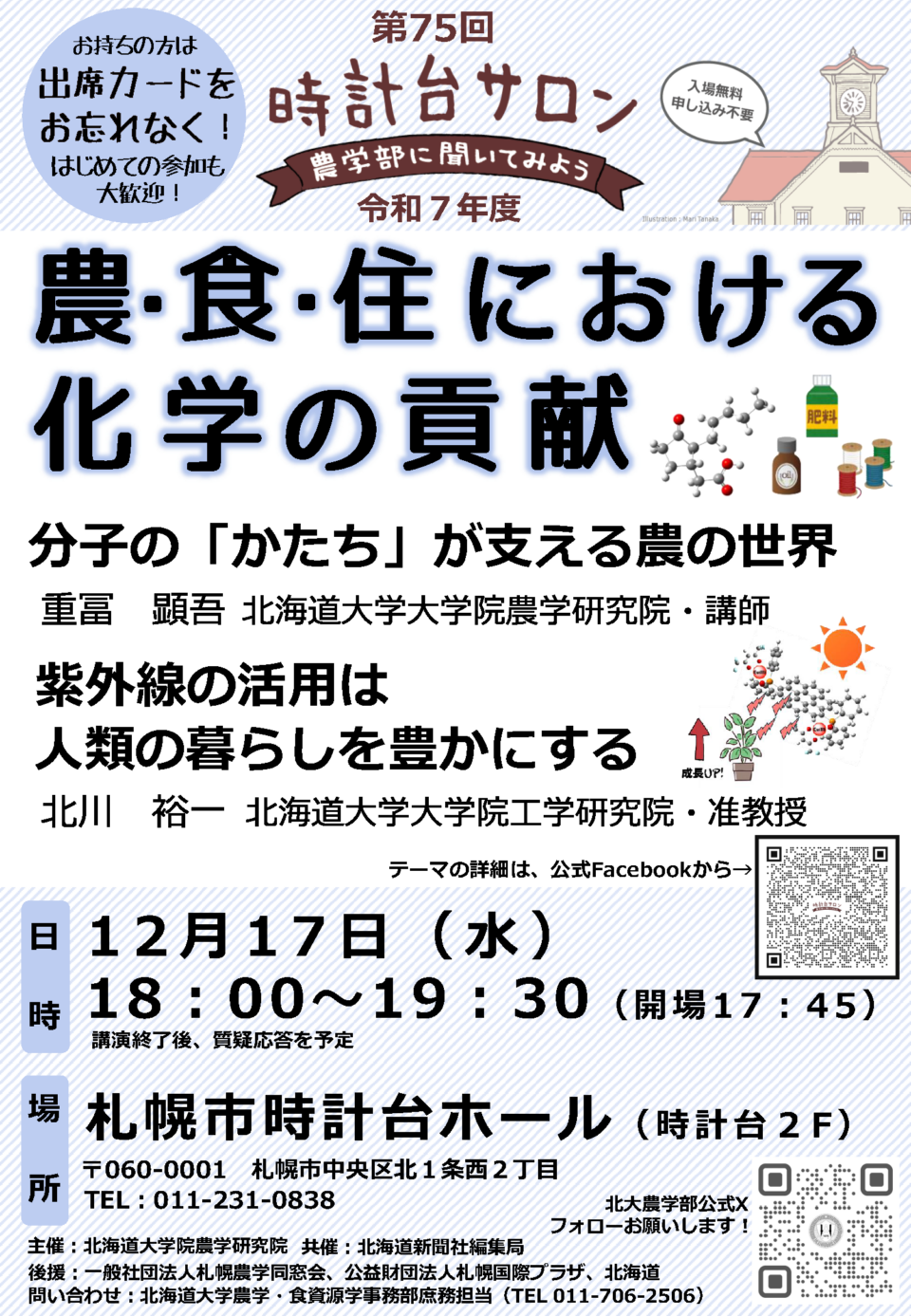 北海道大学農学部・農学院・農学研究院では、札幌市時計台(正式名:旧札幌農学校演武場)において、「時計台サロン『農学部に聞いてみよう』」を開催しています。