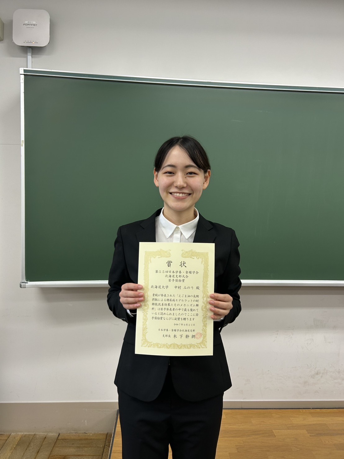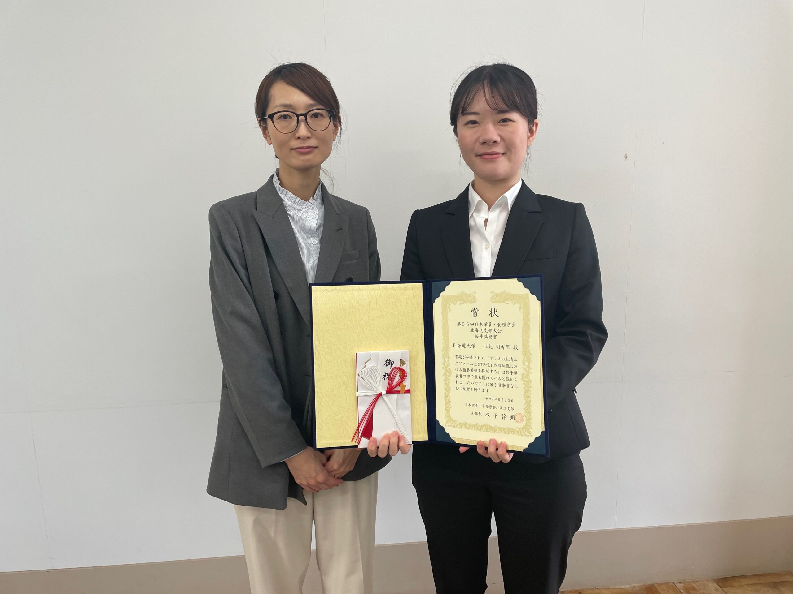農学院生命フロンティアコース修士課程1年の征矢明香里さん(食品機能化学研究室)、中村みのりさん(食品栄養学研究室)が2025年度第55回日本栄養・食糧学会北海道支部大会にて若手奨励賞を受賞