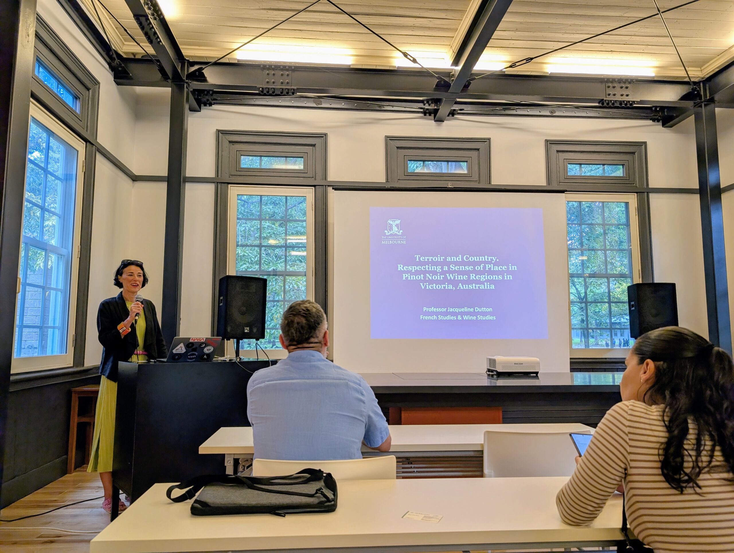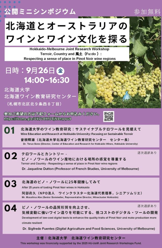 9月26日(金)、北海道ワイン教育研究センターにおいて、北海道大学の戦略的国際パートナーである豪州メルボルン大学とのワイン研究に係るワークショップを開催しました。本ワークショップは、北海道ワイン教育研究センターの曾根輝雄センター長とメルボルン大学教養学研究院のジャクリーン・ダットン研究担当副研究院長のピノ・ノワール生産地域における「テロワール、(豪先住民の文脈での)カントリー、風土」への関心によるもので、気候変動とともに変化しつつある両国のワイン生産地とアカデミアを繋ぐ枠組みのキックオフ・イベントとなりました。