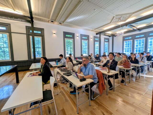 一行は、平川ワイナリー、宝水ワイナリー、山崎ワイナリーなど余市、空知地方のワイン生産地も訪れ、ランギアン期の川端層、トートニアン期の岩見沢層といった古代の地層による土質、ミネラル分の違いからのブドウ品種選択やワインの質感を観察し、生産者との対話を楽しみました。広く美食学や文化的イベントにも繋げることを踏まえ、大学院生の共同教育・研究滞在の可能性も話され、初のワイン研究におけるワークショップは成功裡に終了しました。