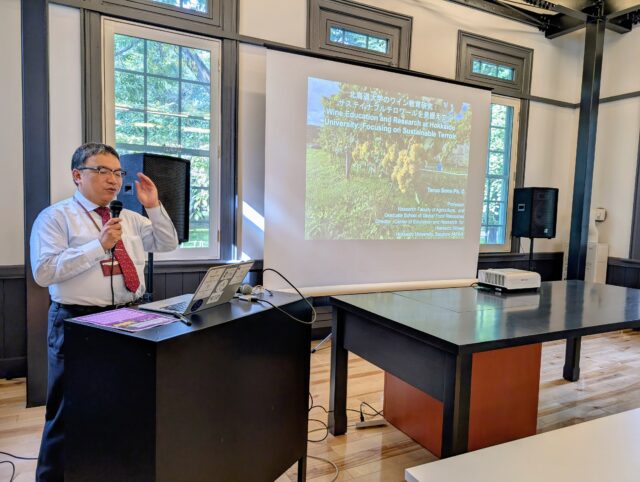 今般はワインの中でも歴史が長く、土地の個性を忠実に表現する品種であり、高価格帯のワインとして特別な地位を確立した今、気候変動と世界市場の変容を受けて、比較的世界中に生産地が広がっているピノ・ノワールを中心に据えています。曾根センター長からは、北海道ワインの一大生産拠点である余市町と協働し、地域と大学の一体的な動きで地域と生産者に貢献する持続可能なテロワールを目指す、センターの取り組みが紹介されました。阿部代表理事からは、北海道ワイン株式会社から独立したシニアソムリエの視点から、この25年間の北海道におけるピノ・ノワール生産、他品種を含めた生産量の移り変わり、温暖化の影響が説明されました。