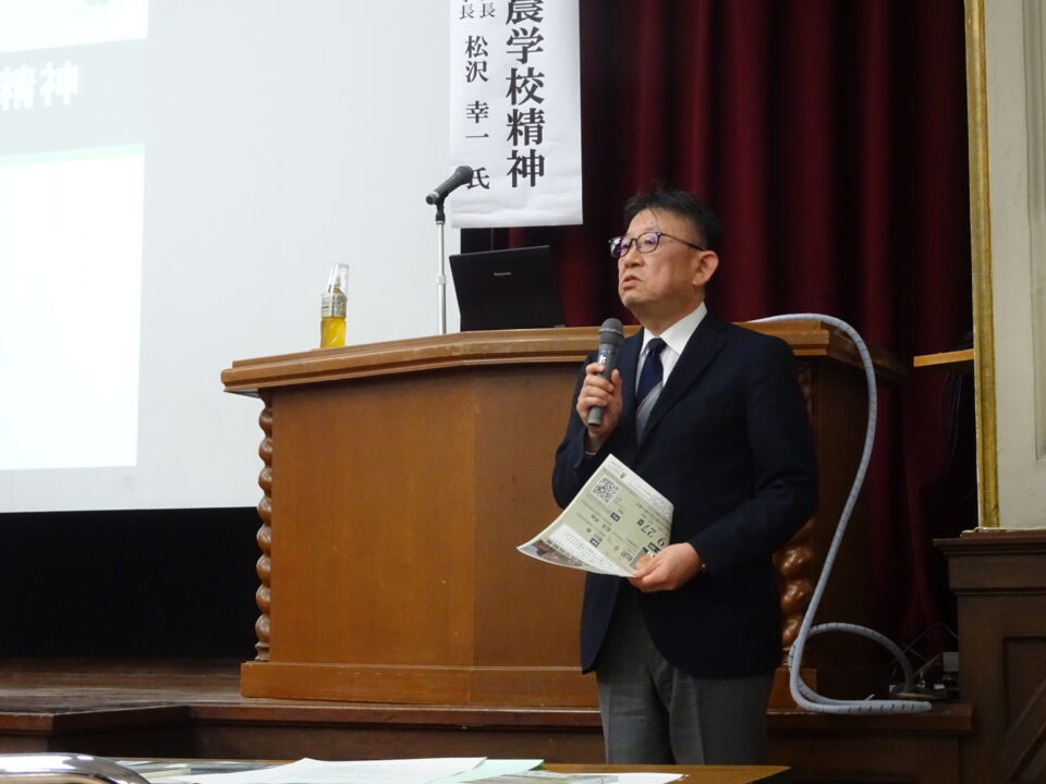 講演会には、同窓生や教職員、学生以外にも一般市民を含め70名以上が参加し、野口 伸農学研究院長による開会挨拶の後、元キリンビール株式会社代表取締役社長の松沢幸一氏に「振り返れば札幌農学校精神」と題して、ご講演いただきました。札幌農学校の沿革と共にW.S.クラーク教頭の教育精神を受け継いだ初期卒業生の業績や志を紹介され、その後、ご自身のこれまでの歩みと農学同窓会での活動についてお話しされました。講演後には、参加者から質問や感想が寄せられ、最後に札幌農学同窓会理事長の松井博和名誉教授から閉会挨拶があり、大変盛会のうちに終了しました。