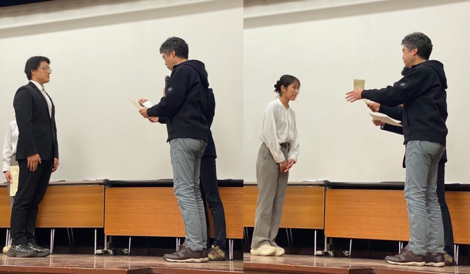 令和7年11月1日の日本造園学会北海道支部大会において、農学院環境フロンティアコース修士課程1年の粒來綾香さん(花卉・緑地計画学研究室)が口頭発表優秀賞を、孫姚正さんが奨励賞を受賞し、賞状を授与されました。