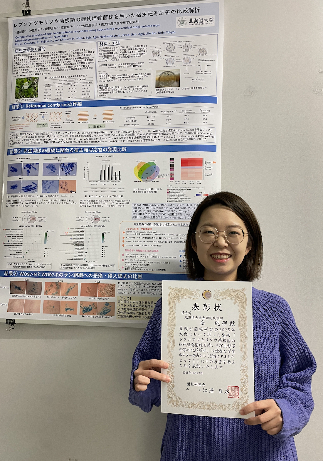 2025年11月29日〜30日に信州大学松本キャンパスで開催された菌根研究会2025年大会(JCOM2025)において、農学院生産フロンティアコース博士後期課程3年の金 純伊さん(作物生理学研究室)が学生ポスター発表賞優秀賞を受賞し、賞状を授与されました。