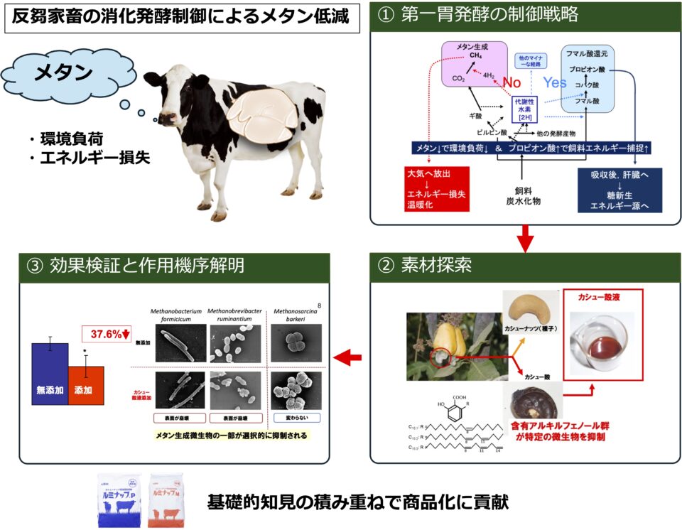 持続可能な反芻家畜生産の実現には、環境負荷軽減と生産性向上の両立が不可欠です。その鍵を握る第一胃(ルーメン)内の共生微生物に着目し、ルーメン発酵の最適化を通した持続的な家畜生産に資する研究を続けてきました。分子手法を活用して、複雑な微生物群集の中から発酵を主導する細菌を特定するとともに、それらの増殖を制御する飼料素材の探索と評価に取り組みました。特に重要な発見はカシュー殻液によるメタン抑制です。カシューナッツの副産物である「カシュー殻液」に含まれる希少フェノール類(アナカルド酸等)が、メタン菌を含む特定の細菌に対し抑制効果を持つことを見いだしました。また、国内外での給与試験によりメタン抑制効果が広く認められることを明らかにしました。基礎から応用までを貫いた一連の研究は、メタン抑制飼料添加物の認可・商品化に大きく貢献しました。